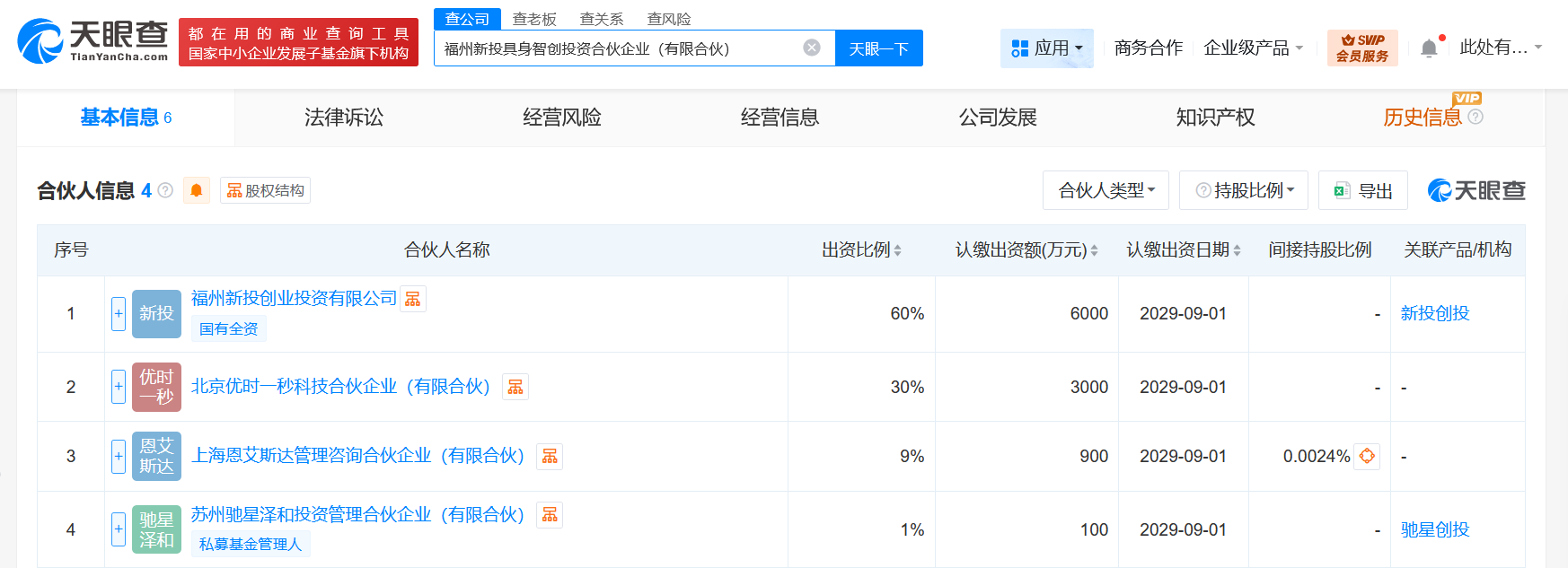 每經AI快訊,天眼查App顯示,近日,福州新投具身智創投資合伙企業(有限合伙)成立,執行事務合伙人為蘇州馳星澤和投資管理合伙企業(有限合伙),出資額1億元人民幣,經營范圍為以私募基金從事股權投資、投資管理、資產管理等活動。合伙人信息顯示,該企業由福州新投創業投資有限公司、北京優時一秒科技合伙企業(有限合伙)、上海恩艾斯達管理咨詢合伙企業(有限合伙)等共同出資。