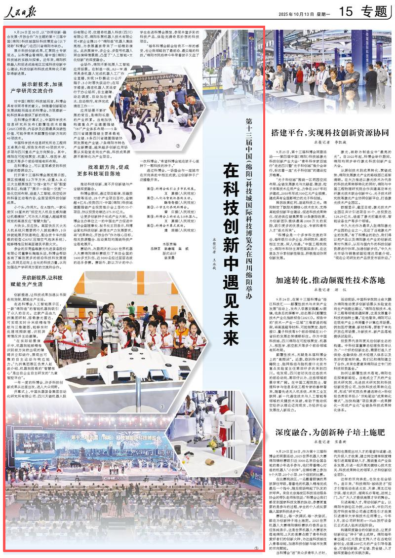 9月26日至30日,以“協同創新·融合發展·開放合作”為主題的第十三屆中國(綿陽)科技城國際科技博覽會(以下簡稱“科博會”)在四川省綿陽市舉辦。