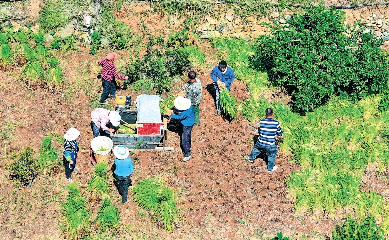 石棉縣新棉街道巖子社區收割節水抗旱稻
