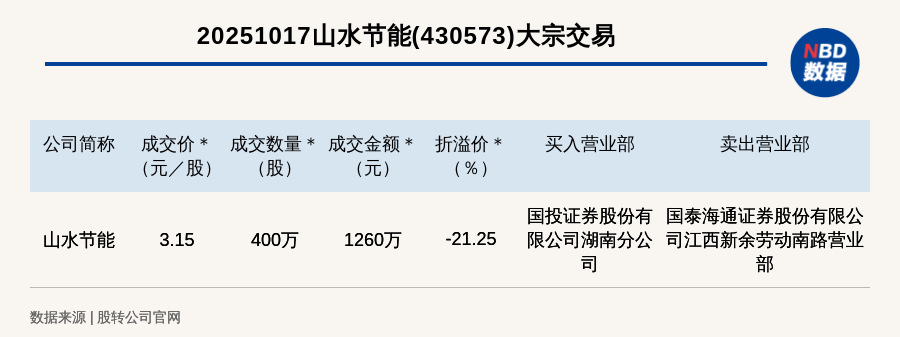 每經訊,2025年10月17日,新三板創新層公司山水節能(430573,收盤價:4元)發生一筆大宗交易,成交價3.15元/股,成交數量400萬股,成交金額1260萬元,折價21.25%。買入營業部是國投證券股份有限公司湖南分公司,賣出營業部是國泰海通證券股份有限公司江西新余勞動南路營業部。