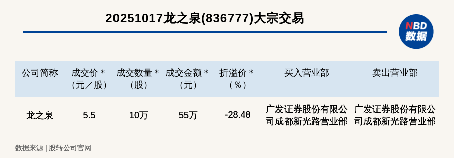 每經(jīng)訊,2025年10月17日,新三板基礎層公司龍之泉(836777,收盤價:7.69元)發(fā)生一筆大宗交易,成交價5.5元/股,成交數(shù)量10萬股,成交金額55萬元,折價28.48%。買入營業(yè)部是廣發(fā)證券股份有限公司成都新光路營業(yè)部,賣出營業(yè)部是廣發(fā)證券股份有限公司成都新光路營業(yè)部。