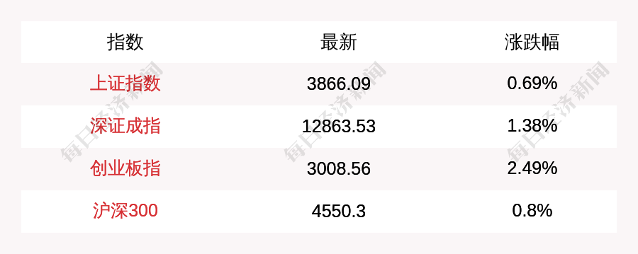 每經AI快訊:北京時間10月20日11:30,上證指數早盤上漲26.33點,漲幅為0.69%,報收3866.09點,成交額5123.62億元;深證成指上漲174.59點,漲幅為1.38%,報收12863.53點,成交額6506.59億元;創業板指上漲73.19點,漲幅為2.49%,報收3008.56點,成交額2980.95億元;滬深300上漲36.07點,漲幅為0.8%,報收4550.3點,成交額3443.42億元。