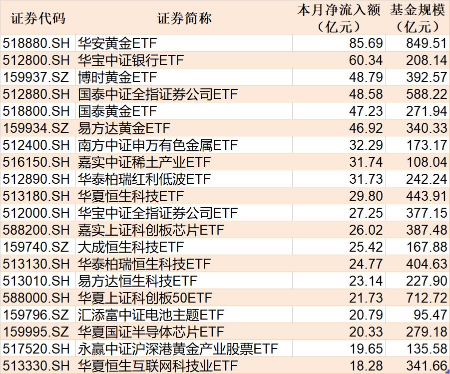 截至10月20日,本月資金凈流入額居前20的ETF名單如下: