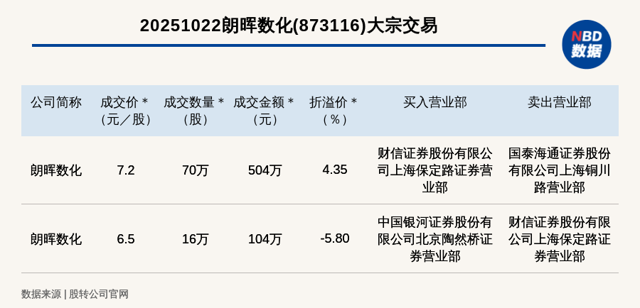 每經訊,2025年10月22日,新三板創新層公司朗暉數化(873116,收盤價:6.9元)發生2筆大宗交易,總成交金額為608萬元,成交金額最高的一筆成交價7.2元/股,成交數量70萬股,成交金額504萬元,溢價4.35%。買入營業部是財信證券股份有限公司上海保定路證券營業部,賣出營業部是國泰海通證券股份有限公司上海銅川路營業部。