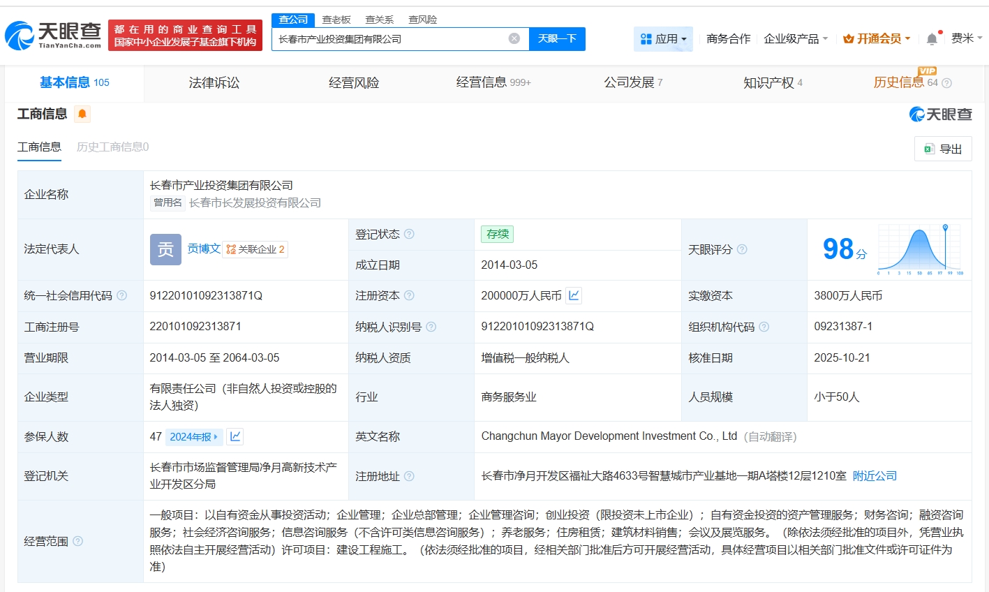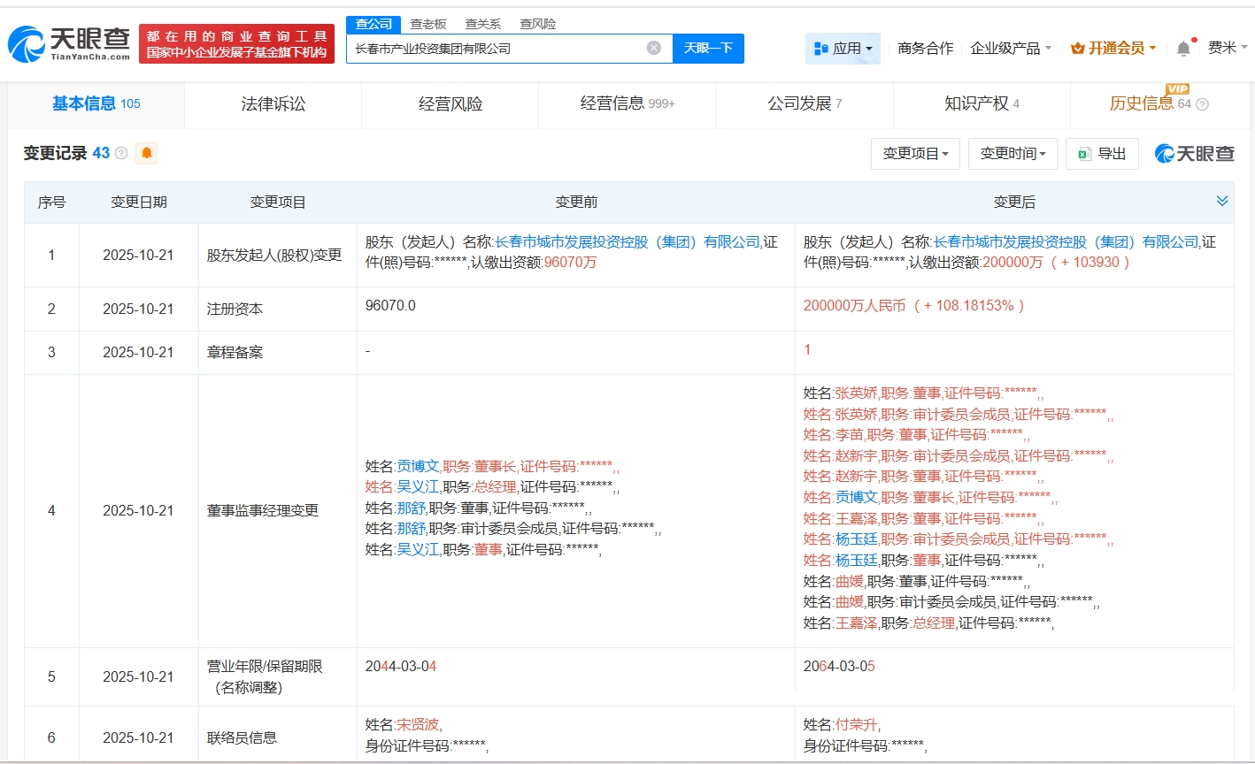 每經AI快訊,天眼查App顯示,近日,長春市產業投資集團有限公司發生工商變更,注冊資本由約9.61億元增至20億元人民幣,增幅約108%,同時發生高管變更。長春市產業投資集團有限公司成立于2014年3月,法定代表人為貢博文,經營范圍包括以自有資金從事投資活動、企業管理、創業投資等。股東信息顯示,該公司由長春市城市發展投資控股(集團)有限公司全資持股。