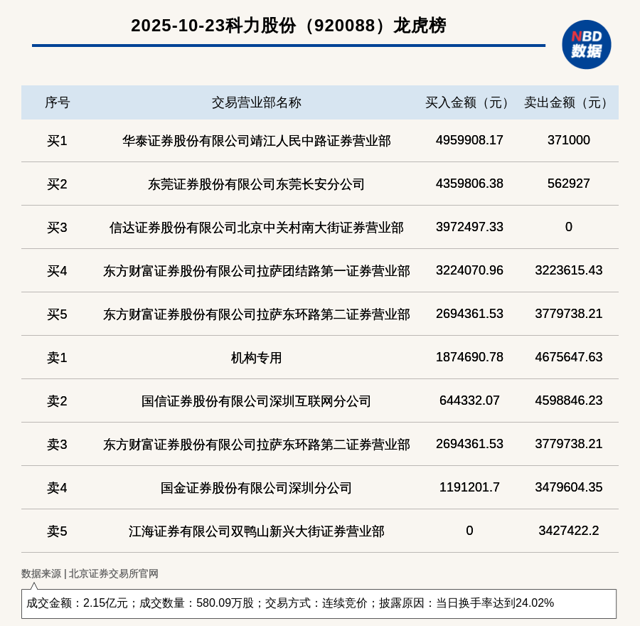 每經訊,2025年10月23日,北交所上市公司科力股份(920088,收盤價:36.56元)登上龍虎榜,交易方式是連續競價,披露原因是當日換手率達到24.02%,成交數量580.09萬股,成交金額2.15億元。買一席位為華泰證券股份有限公司靖江人民中路證券營業部,買入495.99萬元;賣一席位為機構專用,賣出467.56萬元。