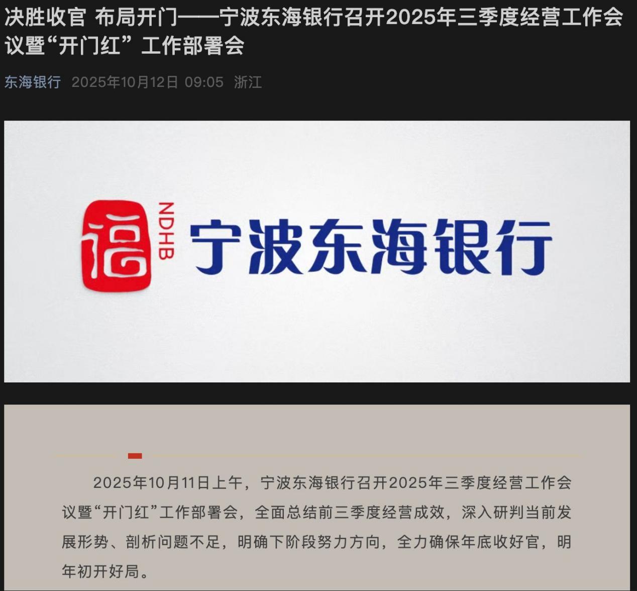 “凝心聚力,決勝收官!”10月以來,各地多家中小銀行會議室里,口號聲此起彼伏。在浙江,寧波東海銀行10月11日召開2025年三季度經營工作會議暨“開門紅”工作部署會,要求“打贏收官攻堅戰,謀好‘開門紅’主動仗”。
