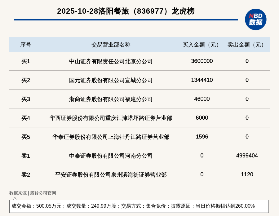 每經(jīng)訊,2025年10月28日,新三板創(chuàng)新層公司洛陽(yáng)餐旅(836977,收盤(pán)價(jià):7.2元)登上龍虎榜,交易方式是集合競(jìng)價(jià),披露原因是當(dāng)日價(jià)格振幅達(dá)到260.00%,成交數(shù)量249.99萬(wàn)股,成交金額500.05萬(wàn)元。買(mǎi)一席位為中山證券有限責(zé)任公司北京分公司,買(mǎi)入360萬(wàn)元;賣(mài)一席位為中泰證券股份有限公司河南分公司,賣(mài)出499.94萬(wàn)元。