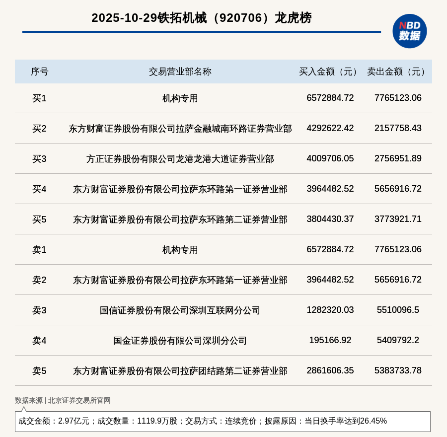 每經(jīng)訊,2025年10月29日,北交所上市公司鐵拓機械(920706,收盤價:27.26元)登上龍虎榜,交易方式是連續(xù)競價,披露原因是當日換手率達到26.45%,成交數(shù)量1119.9萬股,成交金額2.97億元。買一席位為機構(gòu)專用,買入657.29萬元;賣一席位為機構(gòu)專用,賣出776.51萬元。