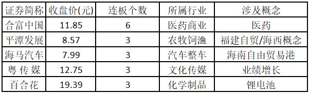 從連板情況來看,今日首板個股有36只;2連板的個股有9只;3連板及以上的個股有5只。今日連板數(shù)排名前5的個股包括合富中國、平潭發(fā)展、海馬汽車、粵傳媒、百合花,具體如下表所示。