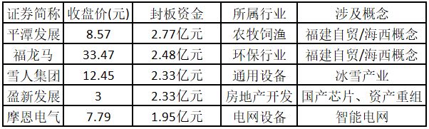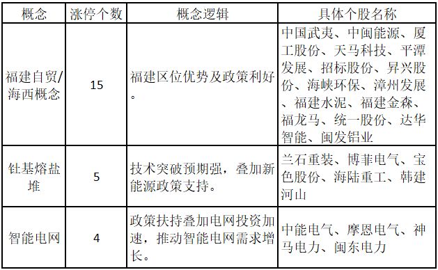 從概念特征來看,今日漲停板個股中,福建自貿/海西概念、釷基熔鹽堆、智能電網(wǎng)概念的個股最多。