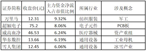 主力資金凈流入金額占市值比例排名前5的個股分別為萬里馬、超穎電子、威高血凈、華東數(shù)控、雪人集團。