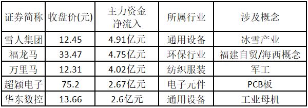 從主力資金來看,今日漲停板個股中,主力資金凈流入金額排名前5的個股分別為雪人集團、福龍馬、萬里馬、超穎電子、華東數(shù)控。