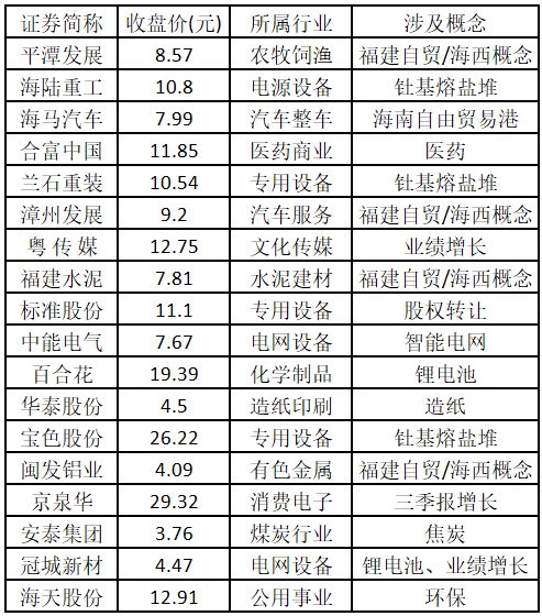 漲停板個股中,股價創(chuàng)出近一年新高的個股有18只(不包括創(chuàng)出歷史新高的個股),包括平潭發(fā)展、海陸重工、海馬汽車、合富中國、蘭石重裝、漳州發(fā)展、粵傳媒、福建水泥、標準股份、中能電氣、百合花、華泰股份、寶色股份、閩發(fā)鋁業(yè)、京泉華、安泰集團、冠城新材、海天股份,具體如下表所示。