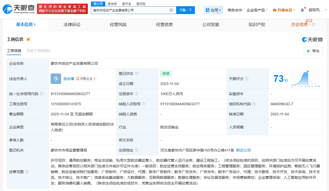 每經(jīng)AI快訊,天眼查App顯示,近日,廊坊市低空產(chǎn)業(yè)發(fā)展有限公司成立,法定代表人為李安博,注冊(cè)資本1000萬(wàn)元人民幣,經(jīng)營(yíng)范圍包括通用航空服務(wù),商業(yè)非運(yùn)輸、私用大型航空器運(yùn)營(yíng)人、航空器代管人運(yùn)行業(yè)務(wù),建設(shè)工程施工等。股東信息顯示,該公司由廊坊市投資控股集團(tuán)有限公司全資持股。