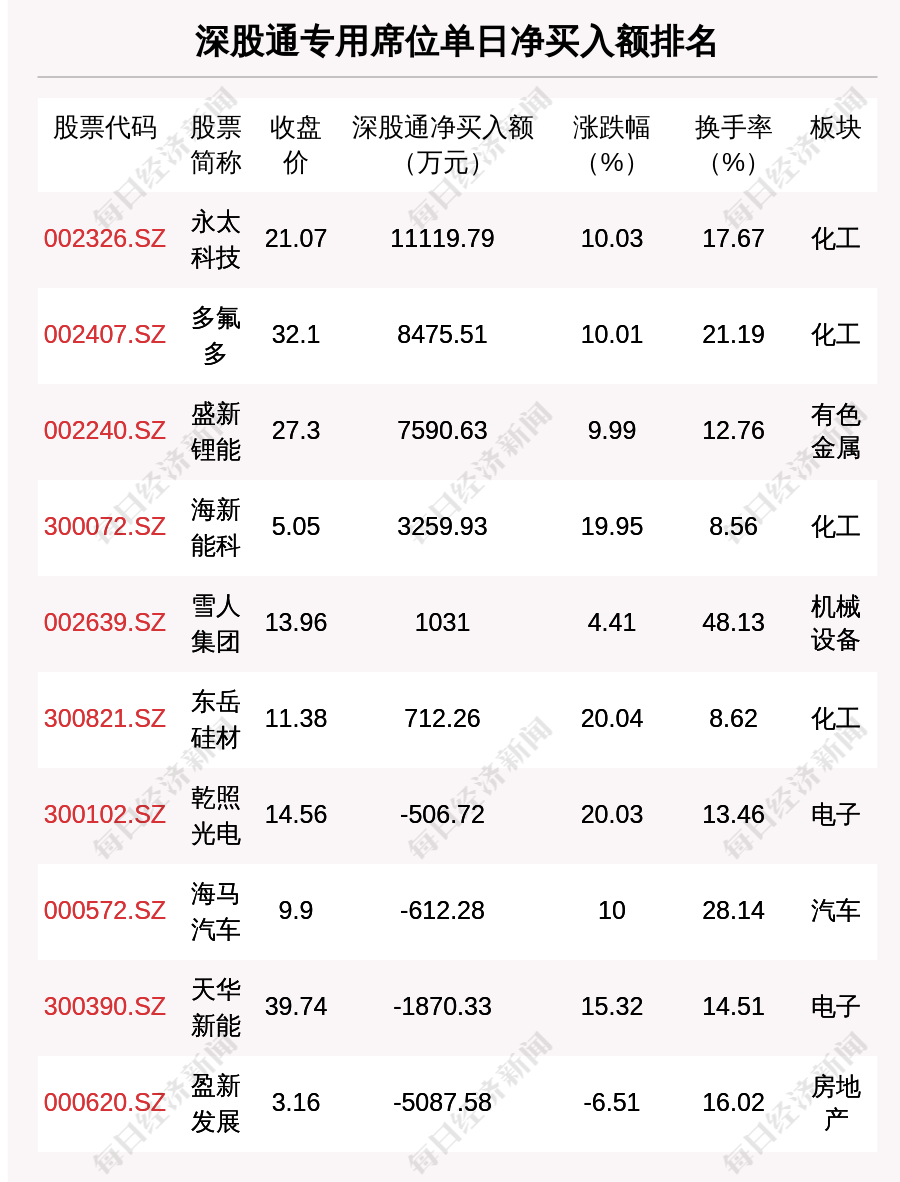 在龍虎榜中,涉及深股通專用席位的個股有14只,永太科技的深股通專用席位凈買入額最大,凈買入1.11億元。