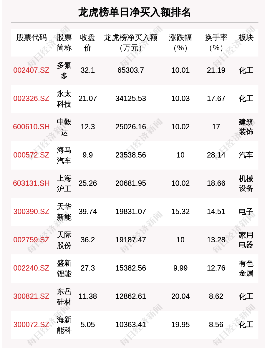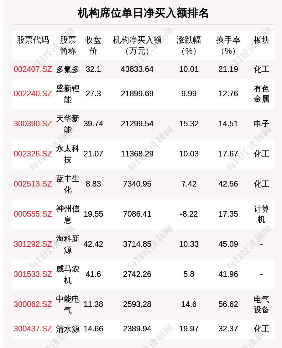 在龍虎榜中,涉及機構專用席位的個股有26只,凈買入額前三的是多氟多、盛新鋰能、天華新能,分別為4.38億元、2.19億元、2.13億元。