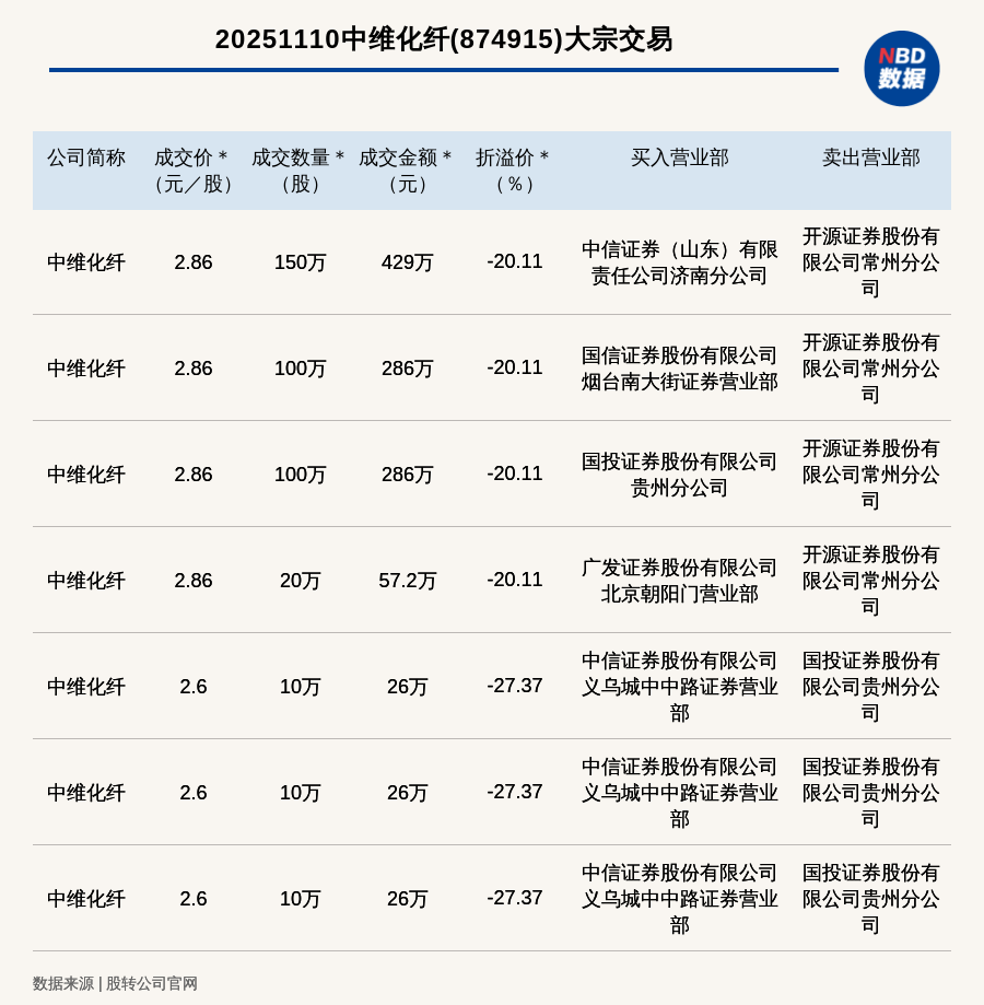 每經訊,2025年11月10日,新三板基礎層公司中維化纖(874915,收盤價:3.58元)發生7筆大宗交易,總成交金額為1136.2萬元,成交金額最高的一筆成交價2.86元/股,成交數量150萬股,成交金額429萬元,折價20.11%。買入營業部是中信證券(山東)有限責任公司濟南分公司,賣出營業部是開源證券股份有限公司常州分公司。