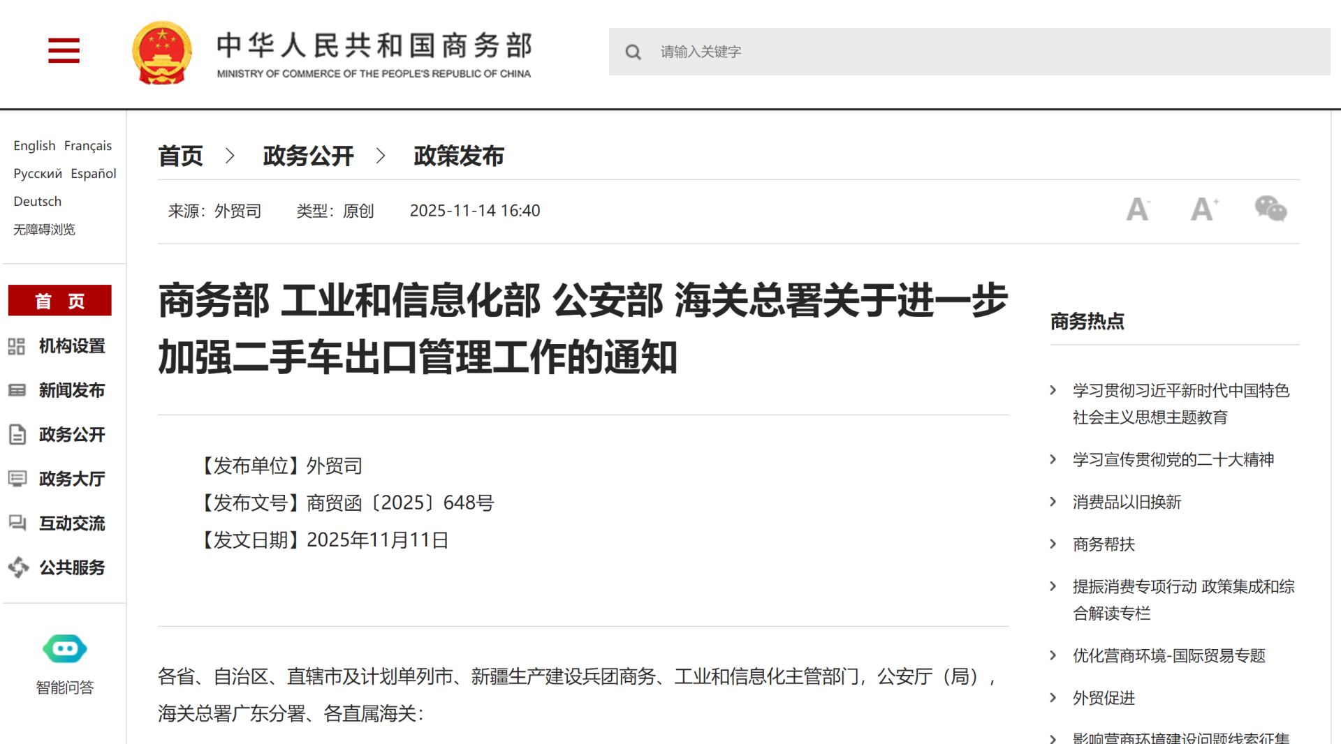 11月14日,據(jù)商務部網(wǎng)站消息,近日,商務部工業(yè)和信息化部、公安部、海關總署發(fā)布關于進一步加強二手車出口管理工作的通知(以下簡稱《通知》)。