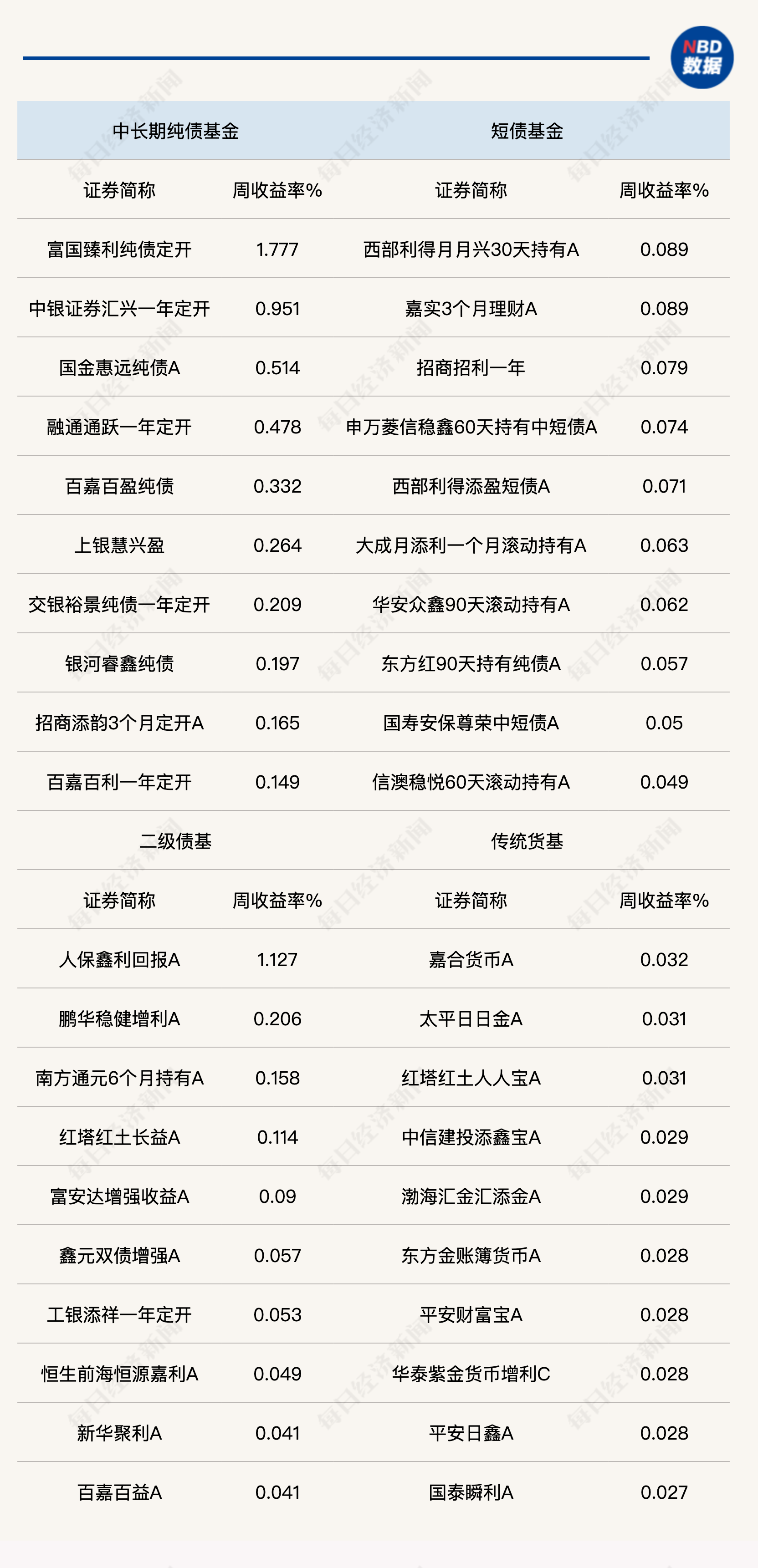 這一點從純債基金的收益率上就能看出。Wind統(tǒng)計顯示,上周中長期純債基金的平均收益率為0.02%,短債基金也為0.02%,對比此前一周來看均有所降低。頭部產(chǎn)品業(yè)績中,富國臻利純債定開的周收益率達(dá)到1.78%,人保鑫利回報達(dá)到1.13%,其余產(chǎn)品則全部在1%以下。