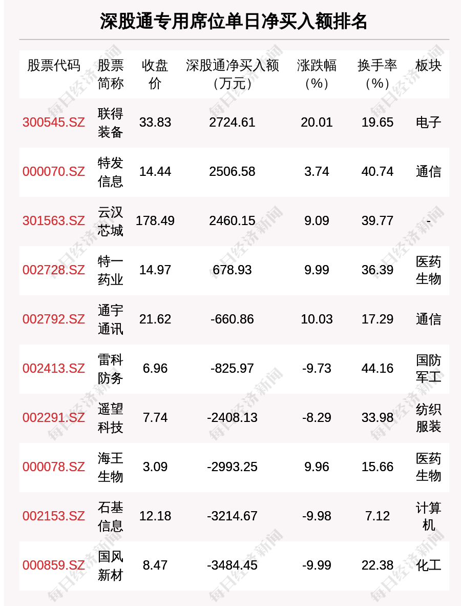 在龍虎榜中,涉及深股通專用席位的個股有10只,聯得裝備的深股通專用席位凈買入額最大,凈買入2724.61萬元。