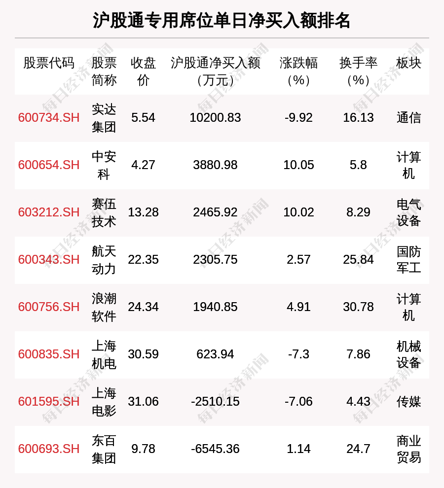 在龍虎榜中,涉及滬股通專用席位的個股有8只,實達集團的滬股通專用席位凈買入額最大,凈買入1.02億元。