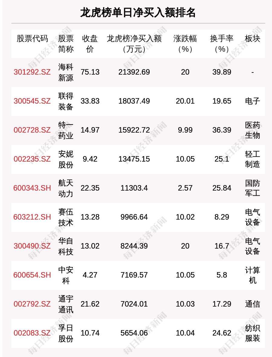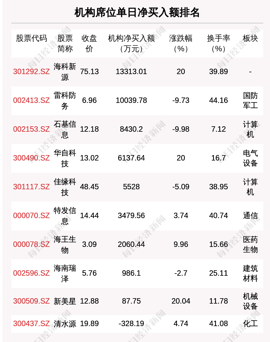 在龍虎榜中,涉及機構專用席位的個股有25只,凈買入額前三的是海科新源、雷科防務、石基信息,分別為1.33億元、1億元、8430.2萬元。