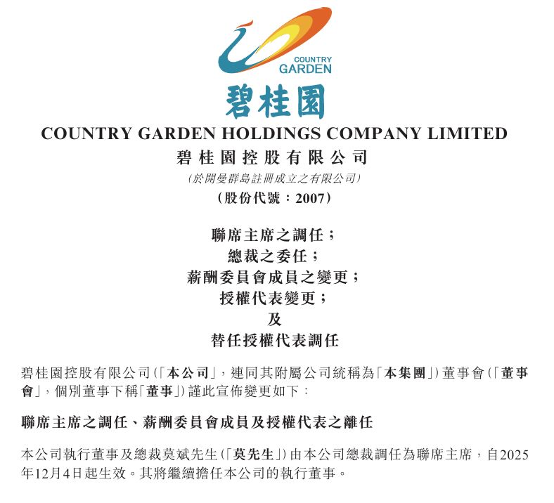 此外,12月4日晚間,碧桂園在港交所公告,公司執(zhí)行董事及總裁莫斌由公司總裁調(diào)任為聯(lián)席主席,繼續(xù)擔(dān)任公司執(zhí)行董事。經(jīng)調(diào)任后,莫斌將負(fù)責(zé)協(xié)助董事會統(tǒng)籌集團(tuán)對外戰(zhàn)略關(guān)系構(gòu)建與資源整合,開展集團(tuán)戰(zhàn)略落地統(tǒng)籌、跨領(lǐng)域重大事項協(xié)調(diào)等工作,助力本集團(tuán)整體經(jīng)營性能提升。莫斌亦已辭任公司薪酬委員會成員,自2025年12月4日起生效。