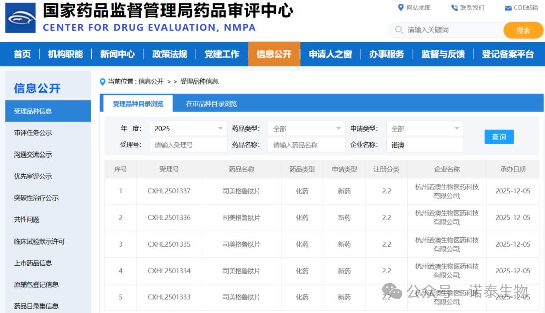 12月5日,諾泰生物(子公司杭州諾澳生物醫藥科技有限公司)自主研發的2.2類新藥司美格魯肽片正式獲得國家藥品監督管理局核準簽發的臨床試驗申請《受理通知書》,含3mg/ 7mg/ 14mg/ 25mg/ 50mg共5個規格。