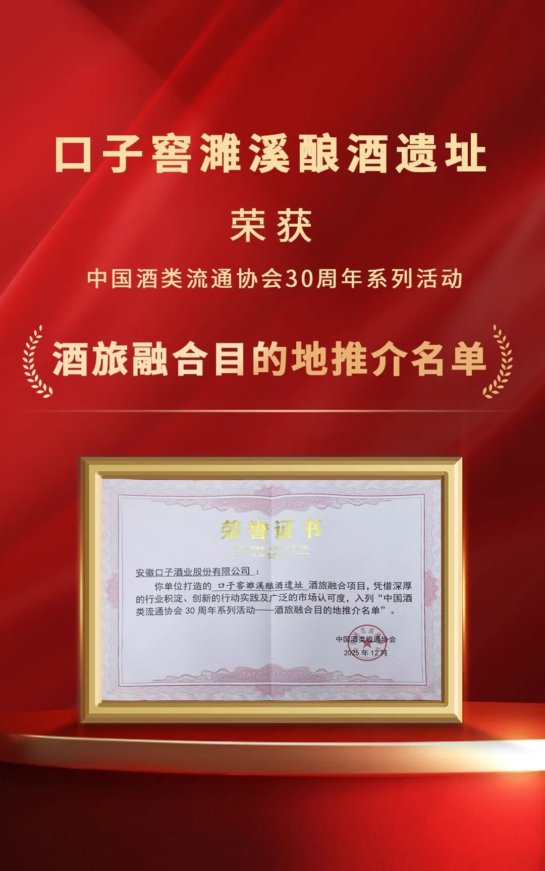 2025年12月4日至5日,以“叁秩成醴·繼往開來”為主題的中國酒類流通協會成立30周年主題活動在北京隆重舉行。口子窖在此次行業盛典中表現卓越,一舉斬獲兩項重要榮譽:口子窖濉溪釀酒遺址入選“酒旅融合目的地推介名單”,口子窖·兼8成功入選“為生活更美好·酒業未來30產品”推介名單。