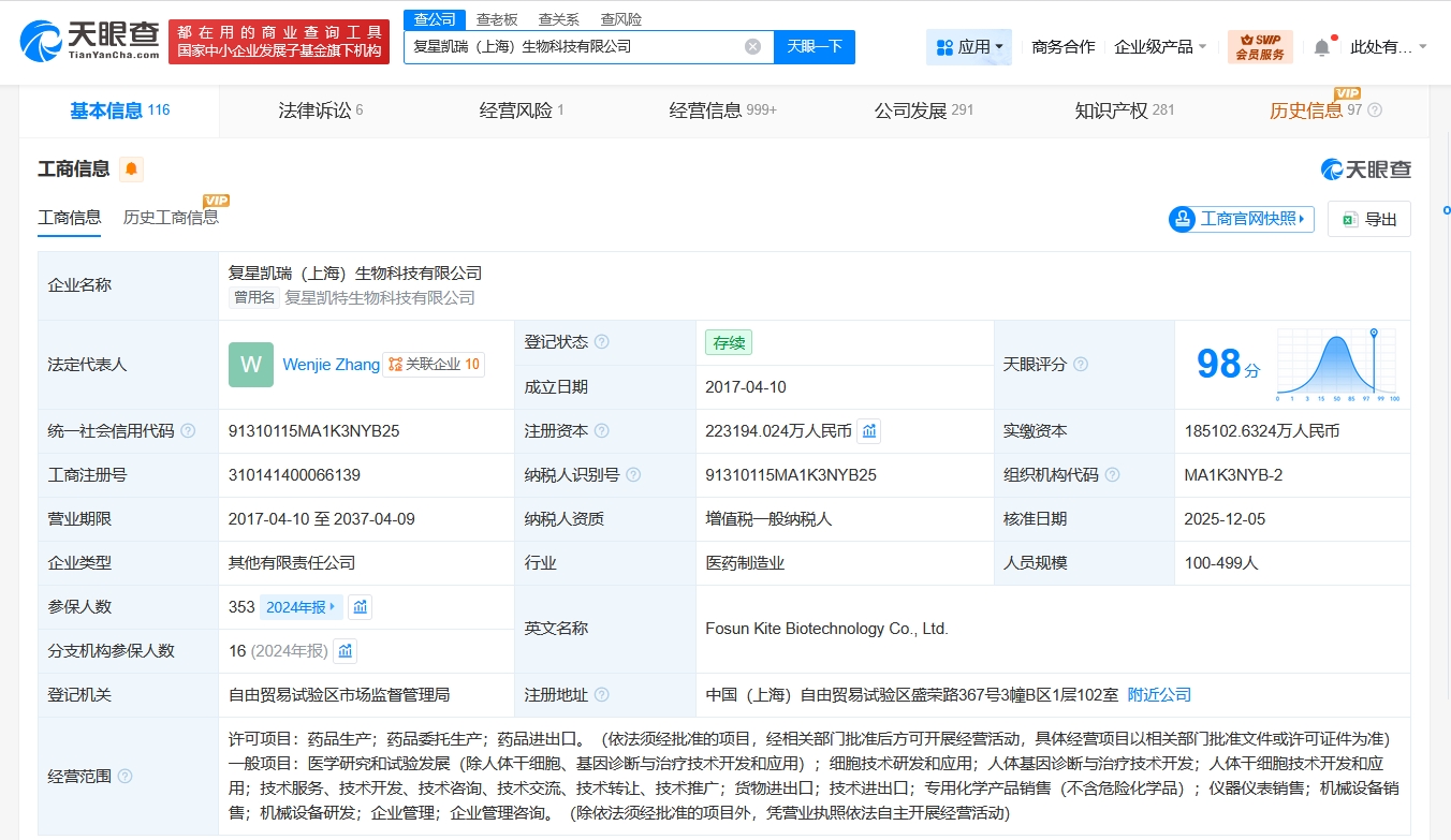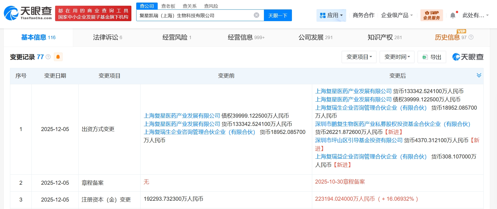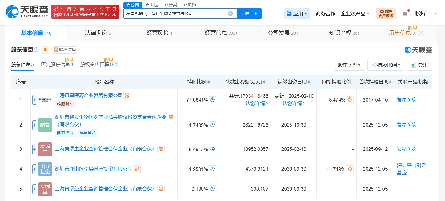 每經AI快訊,天眼查App顯示,近日,復星凱瑞(上海)生物科技有限公司發生工商變更,新增深圳市鵬復生物醫藥產業私募股權投資基金合伙企業(有限合伙)、深圳市坪山區引導基金投資有限公司、上海復瑞益企業咨詢管理合伙企業(有限合伙)為股東,同時,注冊資本由約19.2億元人民幣增至約22.3億元人民幣,增幅約16%。復星凱瑞(上海)生物科技有限公司成立于2017年4月,法定代表人為WenjieZhang,經營范圍含藥品生產、藥品委托生產、藥品進出口、醫學研究和試驗發展、細胞技術研發和應用、人體基因診斷與治療技術開發、人體干細胞技術開發和應用等。股東信息顯示,該公司由上海復星醫藥產業發展有限公司、上海復瑞生企業咨詢管理合伙企業(有限合伙)及上述新增股東共同持股。