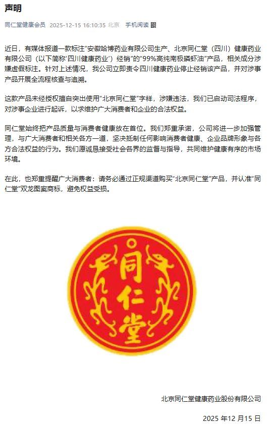 12月15日,同仁堂健康就四川健康藥業經銷的“99%高純南極磷蝦油”成分涉嫌虛假標注發布聲明,責令停售并啟動司法程序。此前上海市消保委檢測顯示該產品磷脂含量為0。同仁堂健康提醒消費者認準正規渠道和商標。此前“同仁堂”多次陷入“真假”紛爭,在股權未統一、線上銷售亂象下,如何維護品牌價值仍是待解難題。
