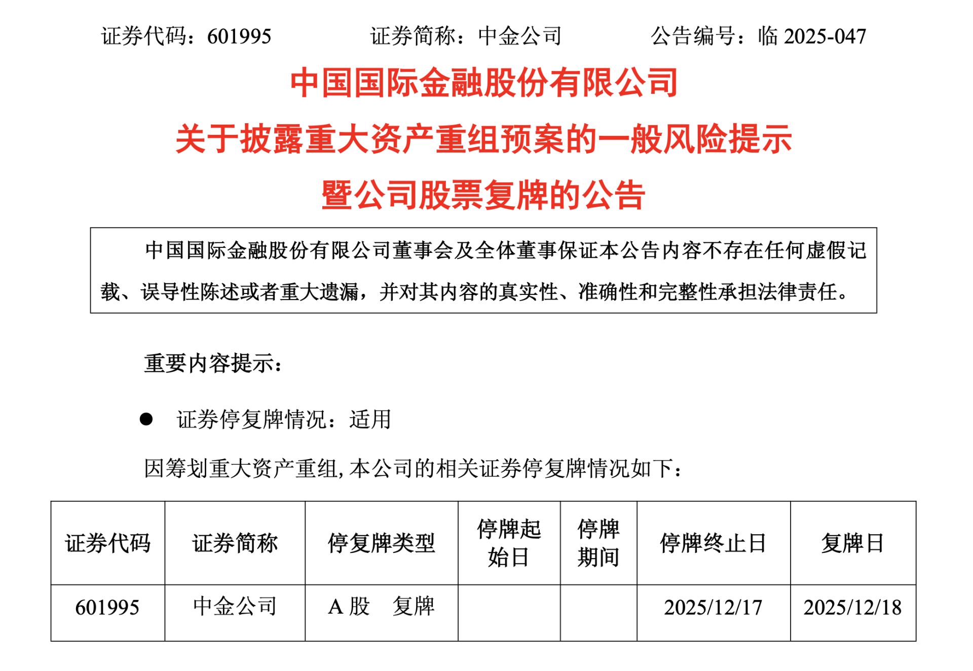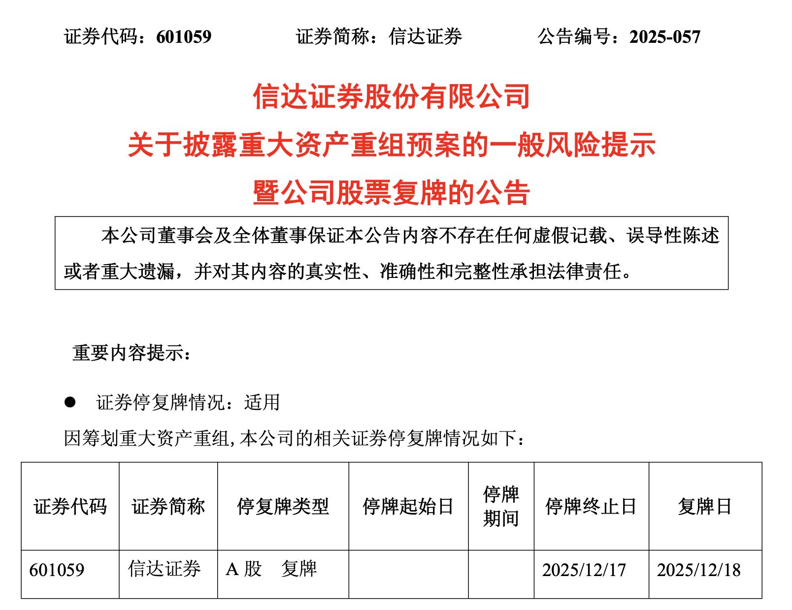另外,東興證券、信達證券也同日公告稱,于2025年12月18日開市起復牌。