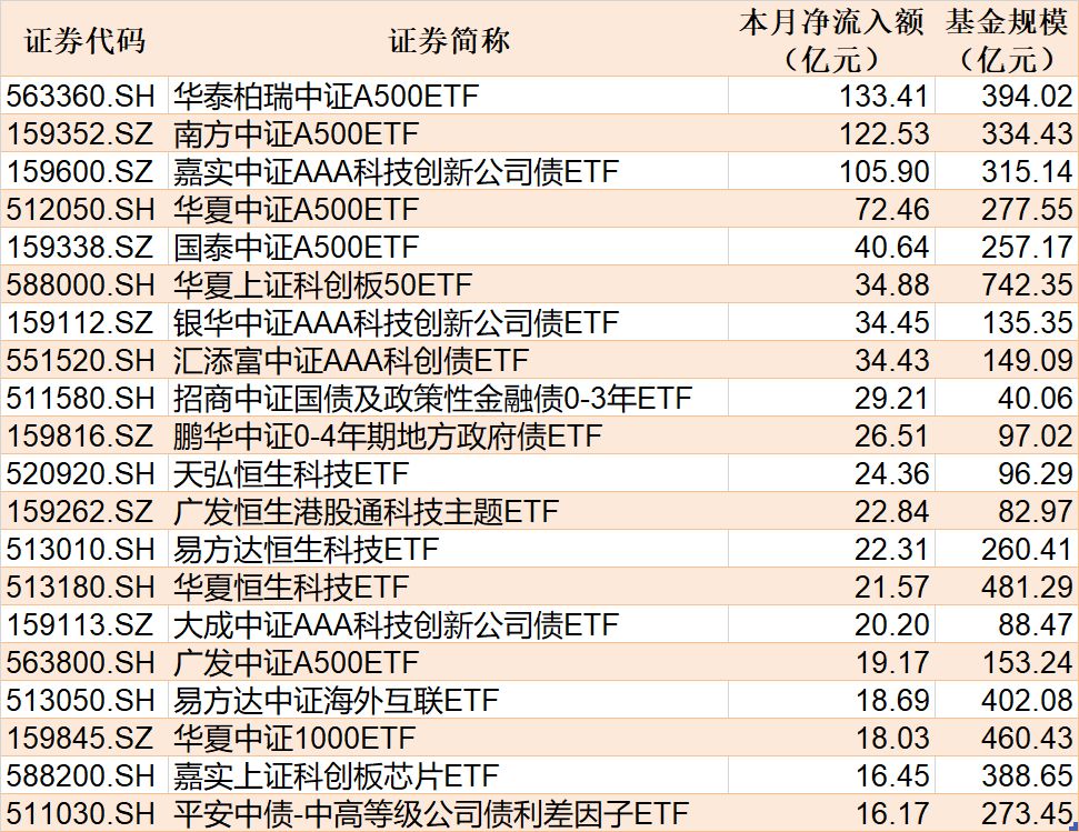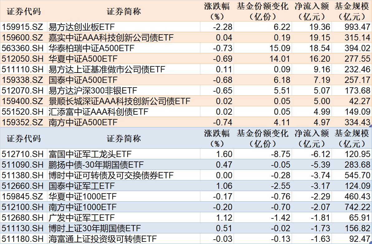 Wind數(shù)據(jù)顯示,在12月18日的非貨幣ETF市場中,易方達創(chuàng)業(yè)板ETF基金份額增加6.22億份,凈流入額19.36億元;嘉實中證AAA科技創(chuàng)新公司債ETF份額增加0.19億份,凈流入額19.15億元;華泰柏瑞中證A500ETF份額增加15.09億份,凈流入額18.54億元。
