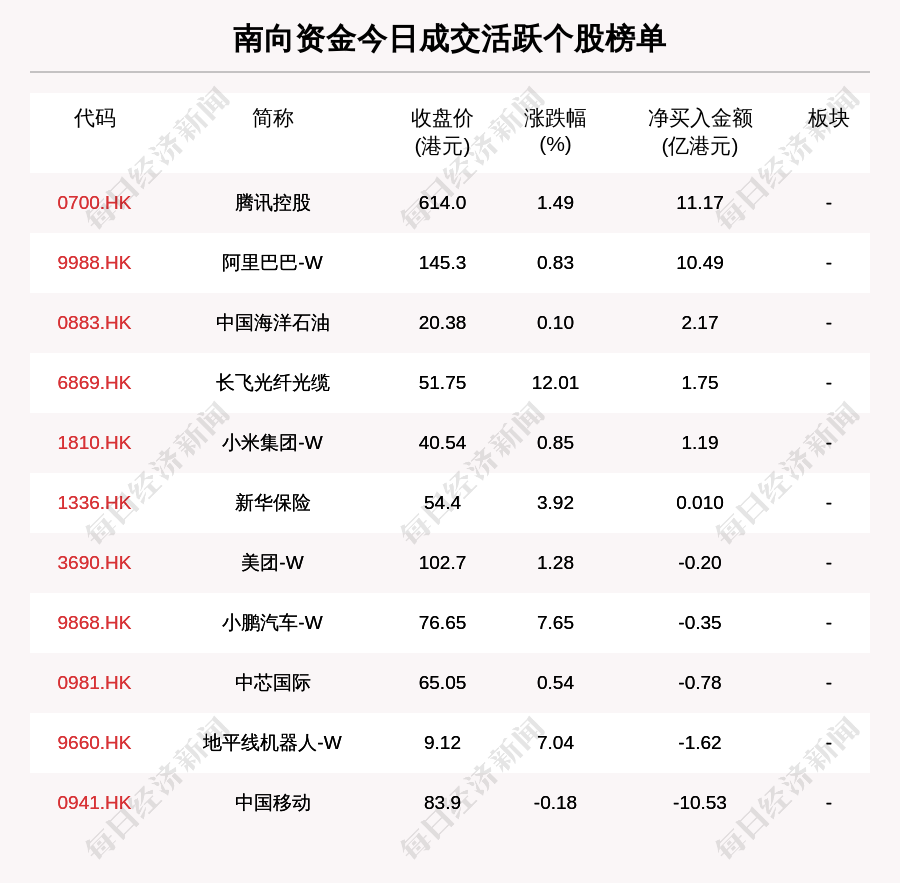 南向資金成交活躍個股榜單中,凈買入個股共6只,金額最多的是騰訊控股(0700.HK,收盤價:614.0港元),凈買入11.170億港元;凈賣出個股共5只,金額最多的是中國移動(0941.HK,收盤價:83.9港元),凈賣出10.533億港元。