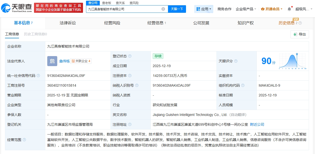 每經(jīng)AI快訊,天眼查工商信息顯示,近日,九江具身智能技術(shù)有限公司成立,法定代表人為詹傳棟,注冊資本約1.4億元人民幣,經(jīng)營范圍包括人工智能應(yīng)用軟件開發(fā)、人工智能基礎(chǔ)軟件開發(fā)、數(shù)字技術(shù)服務(wù)、智能機(jī)器人的研發(fā)等。股東信息顯示,該公司由九江鄱湖新城投資建設(shè)有限公司和優(yōu)必選(09880.HK)分別持股90%、10%。