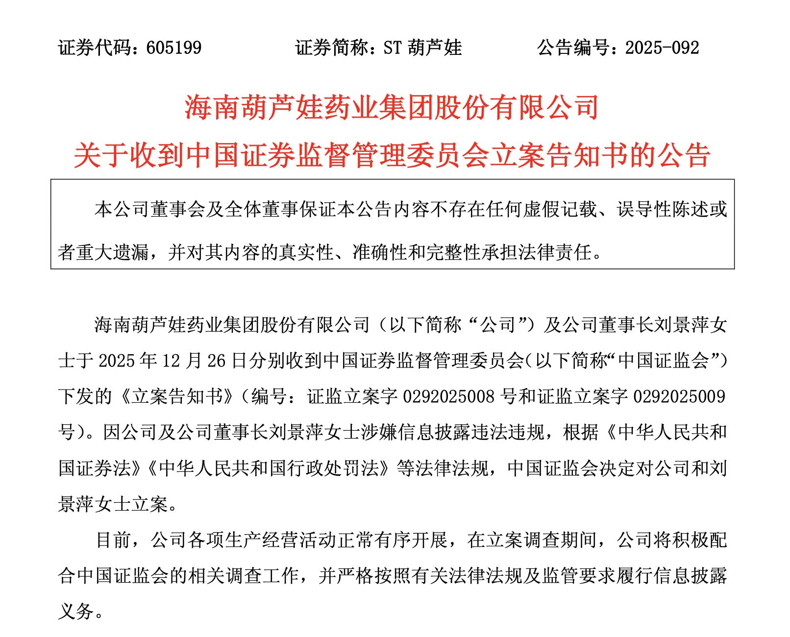 12月28日晚,ST葫蘆娃(605199.SH)公告稱,公司及公司董事長劉景萍于2025年12月26日分別收到中國證監會下發的《立案告知書》。因公司及公司董事長劉景萍涉嫌信息披露違法違規,中國證監會決定對公司和劉景萍立案。