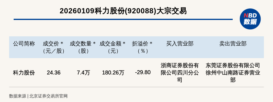 每經(jīng)訊,2026年1月9日,北交所上市公司科力股份(920088,收盤(pán)價(jià):34.7元)發(fā)生一筆大宗交易,成交價(jià)24.36元/股,成交數(shù)量7.4萬(wàn)股,成交金額180.26萬(wàn)元,折價(jià)29.8%。買(mǎi)入營(yíng)業(yè)部是浙商證券股份有限公司四川分公司,賣(mài)出營(yíng)業(yè)部是東莞證券股份有限公司徐州中山南路證券營(yíng)業(yè)部。