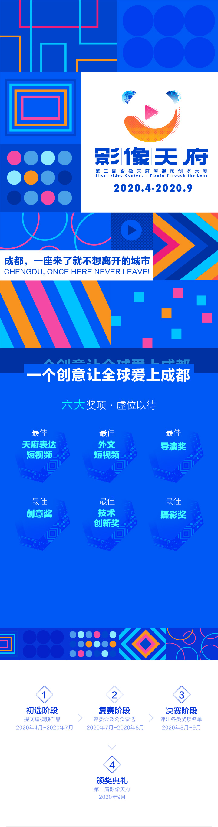 “第二屆影像天府·短視頻創攝大賽”于2020年4月正式啟動,邀約全球創攝愛好者續寫“成都,一座來了就不想離開的城市”篇章,征集優質影像作品。本次大賽設置最佳天府表達短視頻、最佳外文短視頻、最佳導演獎、最佳創意獎、最佳技術創新獎、最佳攝影獎六大專業。評委包括中國電影家協會副主席,上海電影家協會主席任仲倫;艾美獎得主,美國著名影視導演、制片人Mark